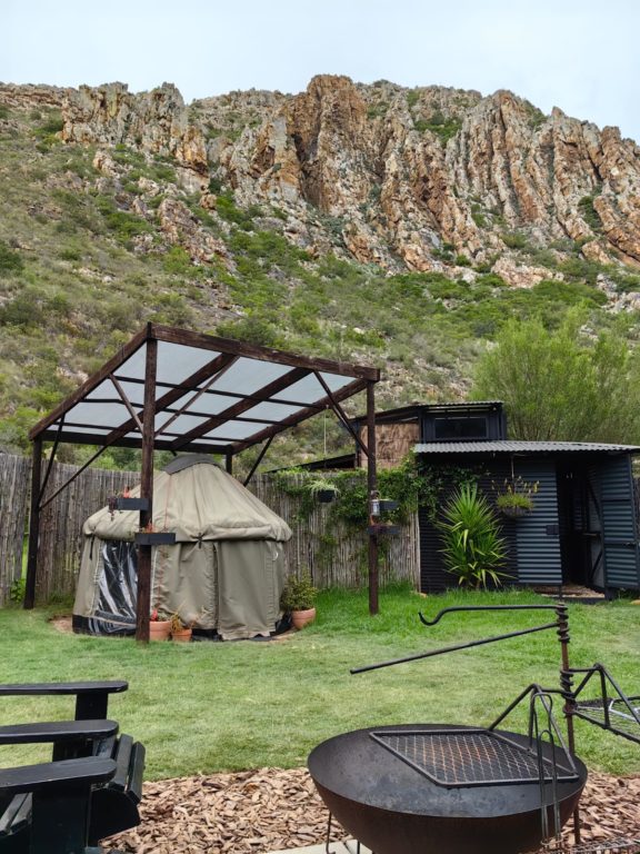 The Yurts camp is situated under a towing cliff, where two resident black eagles soar above. Each site is equipped with a wood-fired hot tub, an outdoor braai place and a kitchen area with a small indoor fireplace.