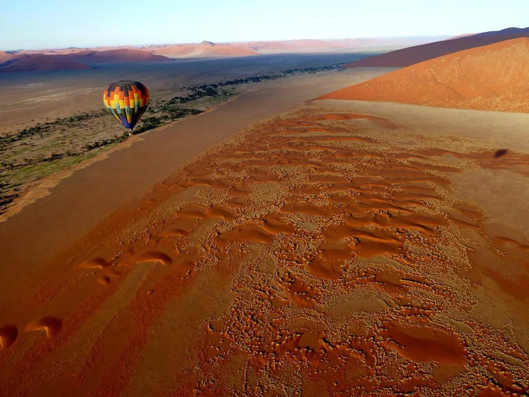 Float silently over the rust-red waves of the Namib Desert, one of the world’s oldest and most photogenic landscapes. Balloon rides over Sossusvlei reveal the surreal geometry of the dunes as the sunrise paints long shadows across the sand — a highlight for many. The cooler, calm mornings between April and November offer the best conditions. Occasional sightings of oryx or ostrich add to the desert magic. Bring a warm jacket, sunglasses, and your camera — you’ll want to capture this silence from the sky.