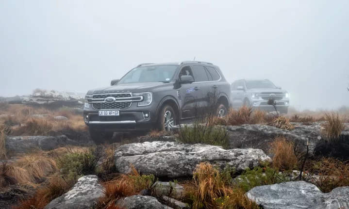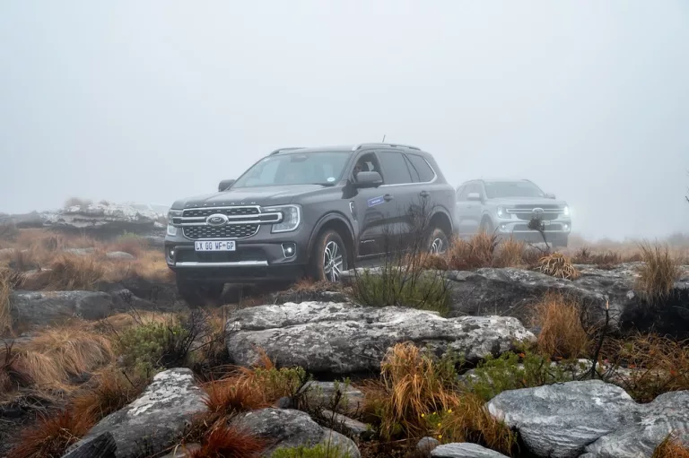 Our surroundings quickly turned from bushveld to shale and red sedimentary rock, the tar road becoming dirt tracks as we began the ascent. With low-range engaged, the convoy took on a steep drop into a river crossing, showcasing the Everest’s wading abilities. At higher altitudes the scenery changes again; forest becomes jungle and after a final, steep climb, the flatter plains of the peak reveal a sheet of local fynbos.