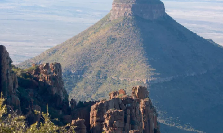 120 m Precariously-balanced Dolerite columns and sheer cliffs rise up from the Camdeboo Valley floor. ‘This is the product of volcanic and erosive forces of nature over 100 million years,’ Graaf Reinet Tourism website explains.