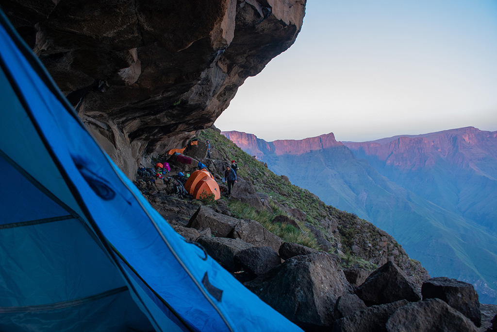 Rustle. Hustle. Boil and bubble. My sleeping bag fizzes against the shiny inflated hiking mat as I wrestle internal debate. Do I kip for another five minutes? I can hear others stirring. Or is it time to get stiff muscles moving again? Actually, I don’t need to exit my sleeping bag to simultaneously sip a hot cup of coffee and marvel at the Mnweni Valley. Unzipping the sky-blue 2,59kg tent (every milligram counts), I see I’m not the only one taking advantage of our scenic perch.