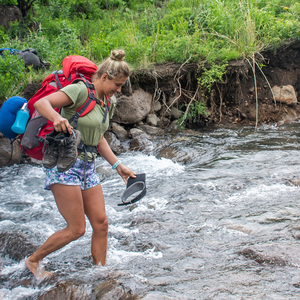 Angie Slabbert crosses one of the many streams that lie en route to the Drakensbefrg escarpment