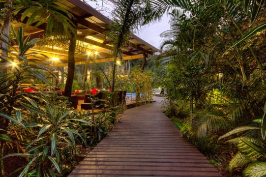 Suites are connected by a wooden pathway over the garden, which also leads to the pool and sundeck.