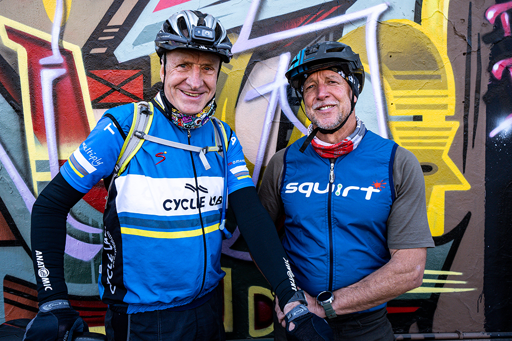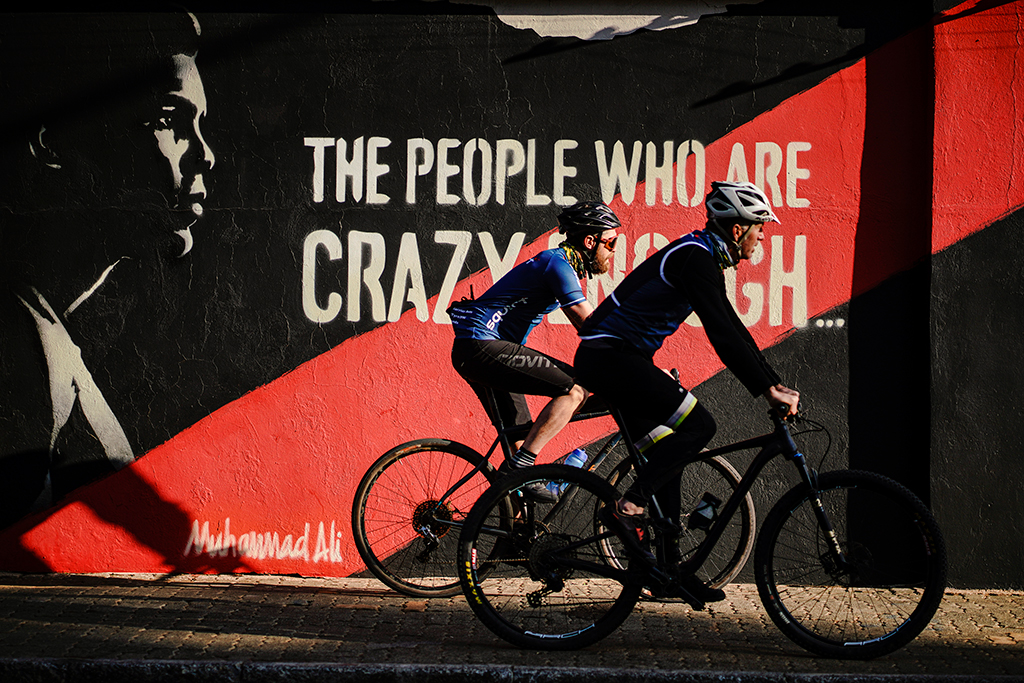 Peter van Kets and Zane Schmahl pedal past a collaboration wall by Rekso le Hond and Fiya One in Greenside.