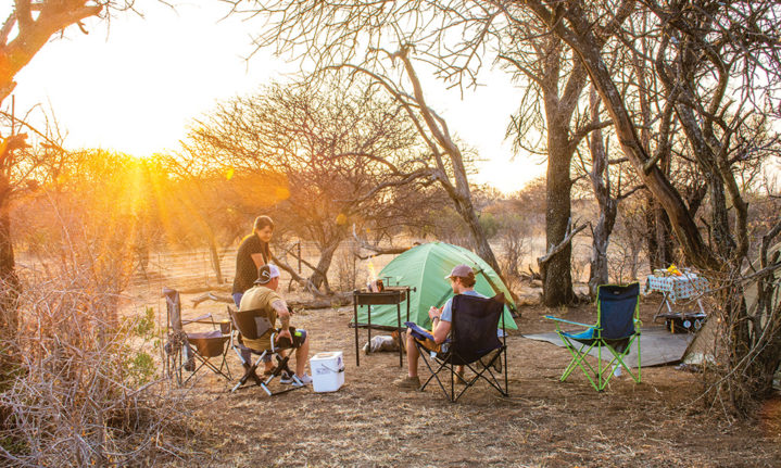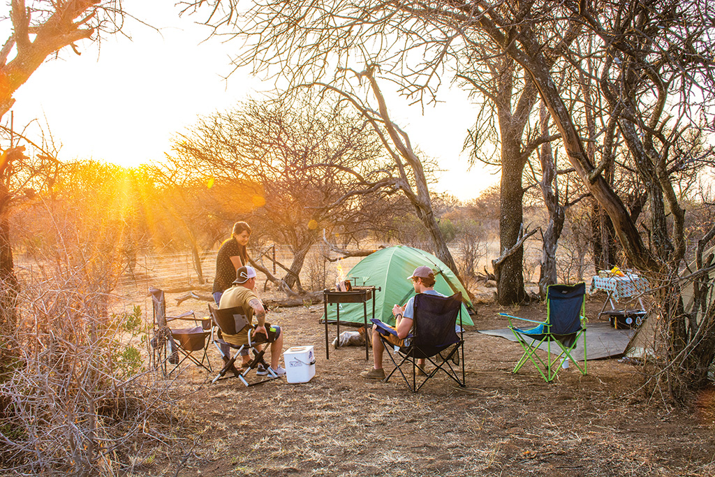 Shaded by acacias and tamboti trees, the four bush campsites are thoughtfully designed and a low, wide electric fence keeps wild animals at bay but enables guests to keep an eye on passing game. Campsite number one has unobstructed views towards the sunset, and each site has its own ablutions – so you can leave your towel on the hook for the whole weekend. Five bigger campsites accommodate caravans and share a bathroom.
