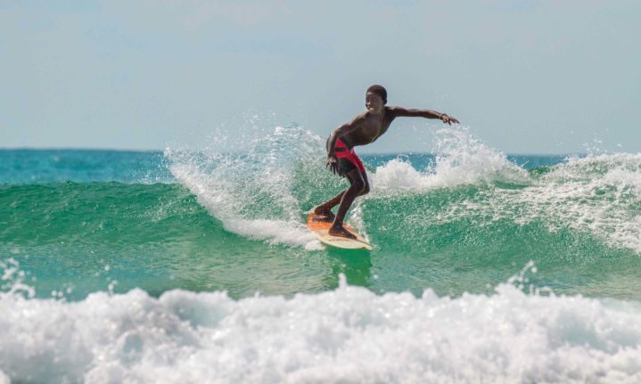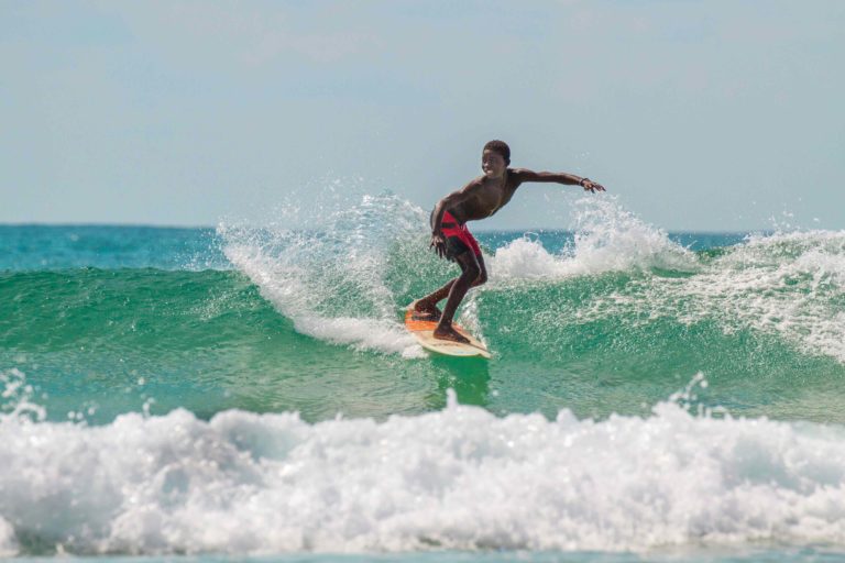 Jorge riding a wave at Tofo Beach. Catherine Hofmeyr.