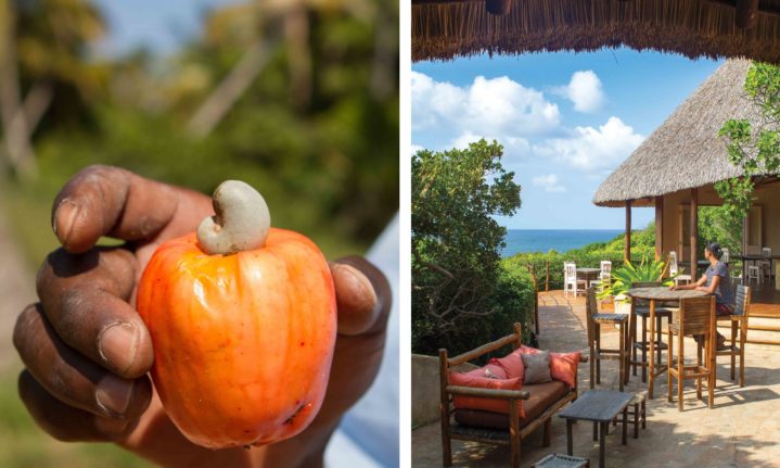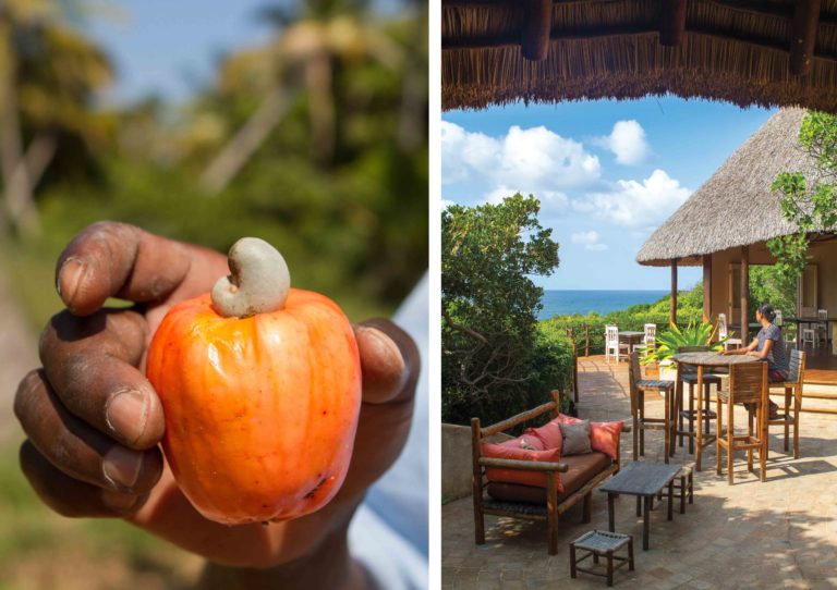 Cashew-tree fruit; drive through coastal forest to reach Dunes de Dovela via Lake Dongane. Images: Catherine Hofmeyr.