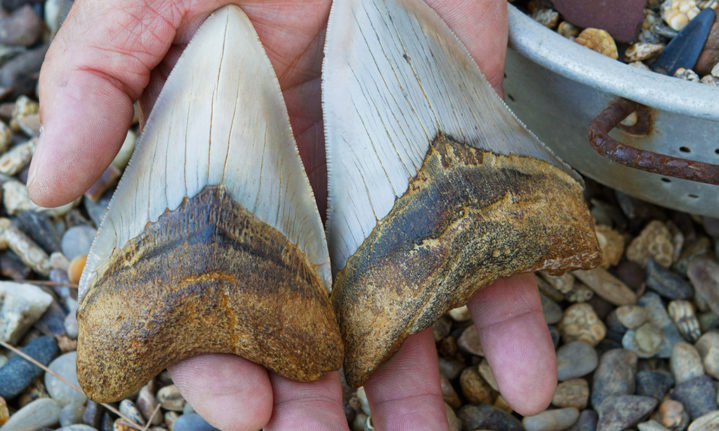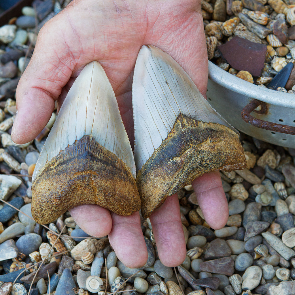 Fossilised teeth from a ‘baby’ Megalodon found by Dudley Wessels – luckily for surfers these 30-metre ancient sharks are no longer around.