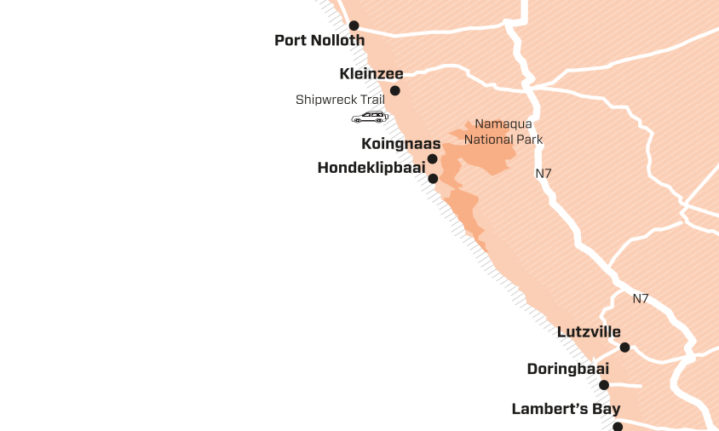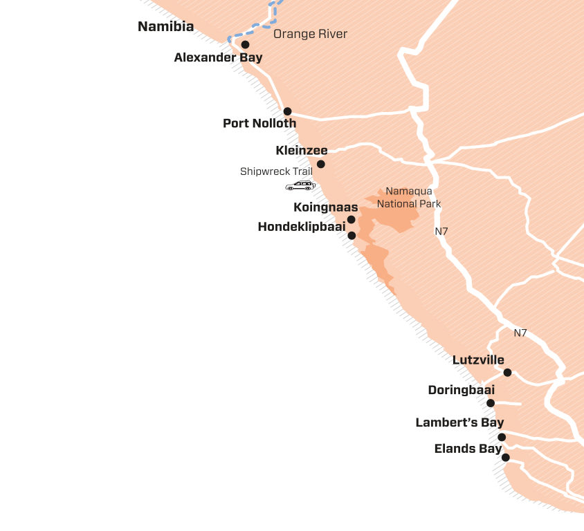 Namaqua National Park has 10 coastal campsites (nine are 4×4 only) with half-moon protective rock walls, eco-toilets and braai places, but no water. R170 a site (max six) plus R48pp daily levy. sanparks.org. South of the park, Waterval Farm has 55 coastal campsites (no facilities at all), R100 a day, 027 652 8709/WhatsApp 063 694 5092. Beyond Waterval, pitch your tent wherever you please. It’s free – return the privilege by leaving your site in pristine condition.