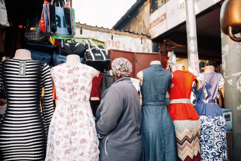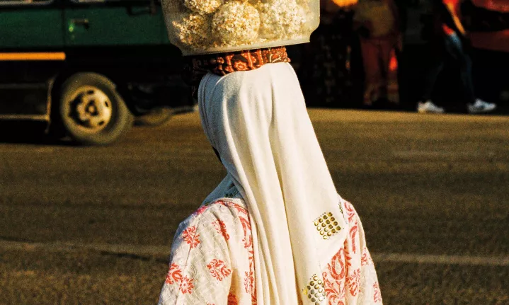 A street trader patiently waits for her turn to cross the road in the busy city of Dares Salaam. – DaresSalaam, Tanzania, 2020