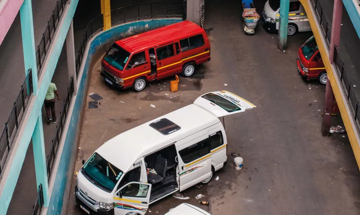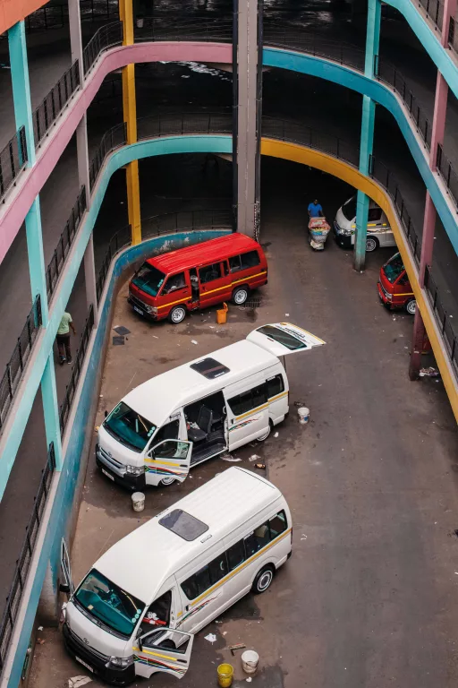 After a busy morning transporting commuters to their workplaces, taxi drivers usually relax at the rank while waiting for the post-work rush, washing half taxis and catching up with each other. Bree Street TaxiRank, Johannesburg, 2018