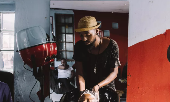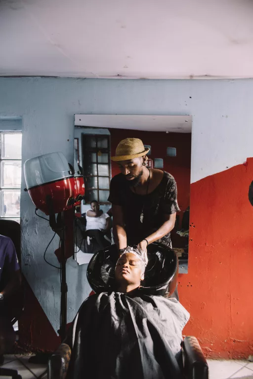 My friend Sifiso Vilakazi owns a hair salon in Meadowlands. He is washing a client’s hair. I have taken many photos of Sifiso in his salon. This time it was for l Elle magazine’s feature on hair salons in the broader Johannesburg area, including towns, suburbs and townships. Meadowlands Zone 2, Soweto, 2018