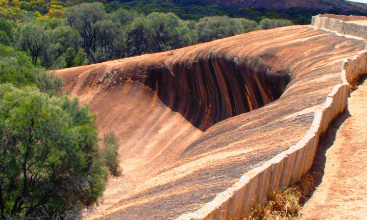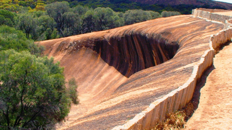This 15m-high granite wave seems frozen mid-crash. It’s a brief but scenic walk near the town of Hyden and pairs well with nearby rock features like Hippo’s Yawn.