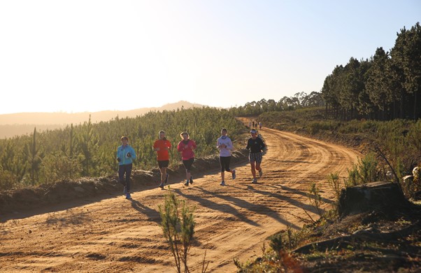 We crested the climb and turned onto the Old Cape gravel road. Even with the damage wreaked by the 2017 fire, the route was beautiful, the views dazzling while the light made its way through the trees as the sun rose. At some point we made our way down a rocky twee-spoor track. Now we were in the real forest and it was this part of the run that I enjoyed the most. Truly immersed in nature, running didn’t seem so bad. After about 6km we eventually rejoined Old Cape Road, passed Simola Golf Club and began the run down to Knysna Town.